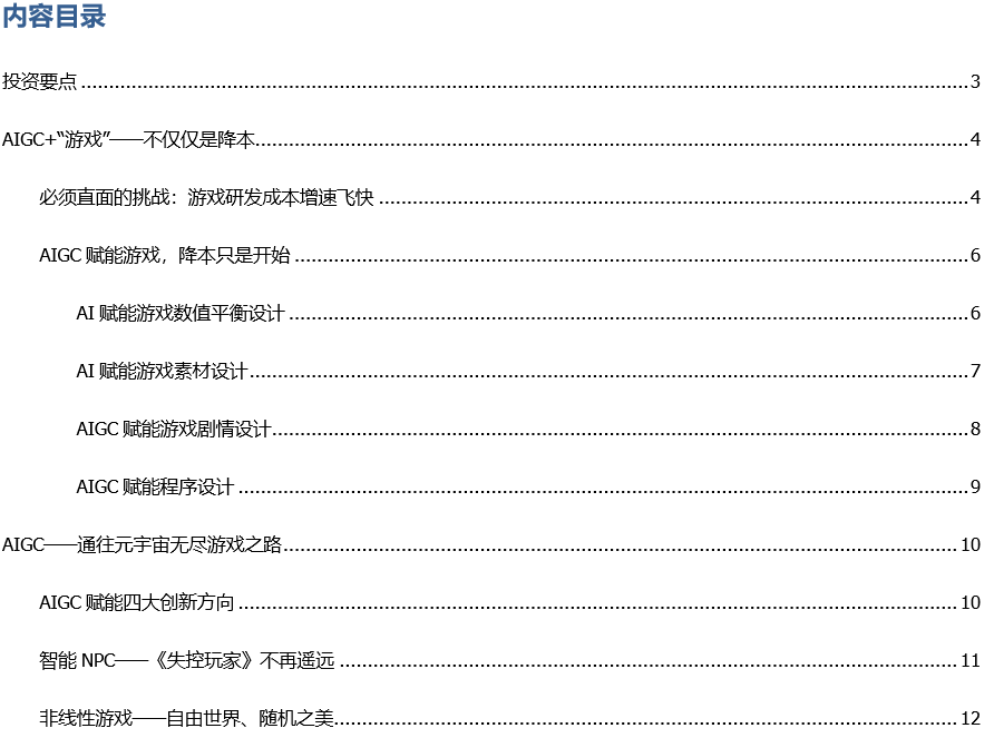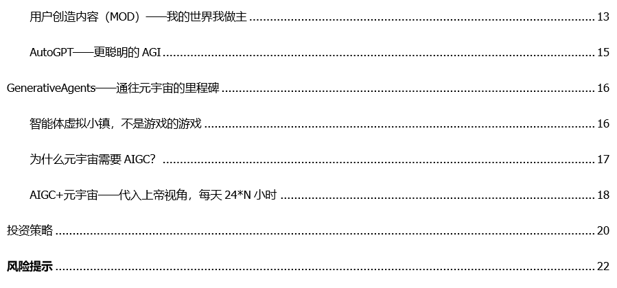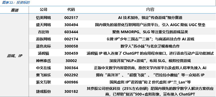 2022年我们在全市场首篇AIGC深度报告《Web3时代的生产力工具》中,展望了生成式AI带来的产业巨变。在全球各大巨头纷纷入局、模型、数据、算力快速升级的当下,AIGC将推动数字世界快速向元宇宙进化,本文将分享我们对该领域的最新理解——无尽游戏、未来已来。 未来的赛博世界是“游戏”,更是生活日常。站在 AIGC 应用的角度,我们聚焦“游戏”,之所以打引号,是因为我们讨论的游戏并不仅仅是娱乐,未来更将是融入学习、社交、创作、分享的元宇宙。登陆这一赛博空间,可能是一天工作、生活、学习的开始。“游戏”这一模式更容易被 Z 世代接受,而 AIGC 对这代数字原住民的影响会更大。 AIGC+“游戏”,降本只是开始。AIGC 在文字、图像、编程、视频领域展现的能力让游戏制作在数值平衡、素材、剧情、编程等领域的成本有望大幅降低。我们认为,降本只是开始,AI 助力打破“高效率、高质量和低成本”不可能三角的同时,将大幅降低用户在“游戏”世界中的创作壁垒,正如当年 UGC 爆发造就了短视频、直播等业态,AIGC 将催化创意和流量的大爆发。 AIGC—通往元宇宙无尽游戏之路。AIGC 将使游戏创新的试错成本大幅降低,NLP 也将推动人机交互体验到新的维度。我们梳理产业看到,智能 NPC、非线性游戏、用户创造内容(MOD)等将呈现赛博空间的随机之美,让《失控玩家》中所展现的 NPC 剧情不再遥远。上述技术在《荒野大镖客 2》、《模拟飞行》以及 Roblox 中均有展示,而近期 AutoGPT 的出现使得 AI 能根据用户需求自主分析问题,给出具体的执行计划并得出结果,如果将这一功能结合多模态,我们相信最新的游戏玩法迭代已经在路上。 GenerativeAgents—通往元宇宙的里程碑。在由斯坦福大学和谷歌联合发表的一篇名叫《GenerativeAgents:Interative Simulacra of Human Behavior》论文中,研究者们成功地构建了一个“虚拟小镇”,其中的 25 个智能体在小镇上生存。借助 AIGC,其中的 NPC 具备了可信人类行为,并对周围环境变化做出适当的反应,使得可以用现实社会现象去填充赛博空间。 AIGC+元宇宙——代入上帝视角,每天 24*N小时。我们已经可以实现用 GPU+ 电能生产内容,未来随着垂直模型的训练成本降低、效率提高,互动性将大幅提升,针对游戏、直播、工作等不同场景的数字助理将应运而生,虽然看起来像一个大型游戏,但它真的还是游戏吗?代入上帝视角后,用户可以穿越于不同的赛博空间中,从内容参与的角度看,我们每天的时间或许会变成 24*N,而元宇宙将成为无尽的游戏。 AIGC投资框架:算力、模型、应用、数据。算力是 AIGC 蓬勃发展的基石,看好光通信及边缘算力,包括新易盛、中际旭创、天孚通信、太辰光、德科立、锐捷网络、寒武纪、美格智能、紫光股份、中兴通讯等;模型层关注国内外大模型的边际变化,包括昆仑万维、三六零、科大讯飞;应用层看好游戏的迭代创新,包括恺英网络、神州泰岳、盛天网络、游族网络等;数据层包括监管将是贯穿 AIGC 发展的挑战,看好中国移动、中国电信、中国联通以及浩瀚深度、新华网、人民网等,详见正文投资策略。 风险提示:伦理风险:AI 驱动的人工智能交互过程中,可能出现伦理风险。技术发展不及预期:AIGC 的技术发展不及预期。以及底层硬件技术,如:超级计算机、算力等。政策法律监管风险:随着相关法律的逐步完善,或出现法律监管的问题。 |