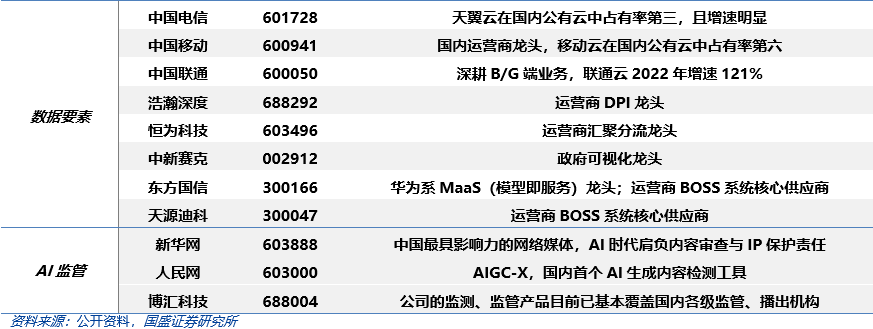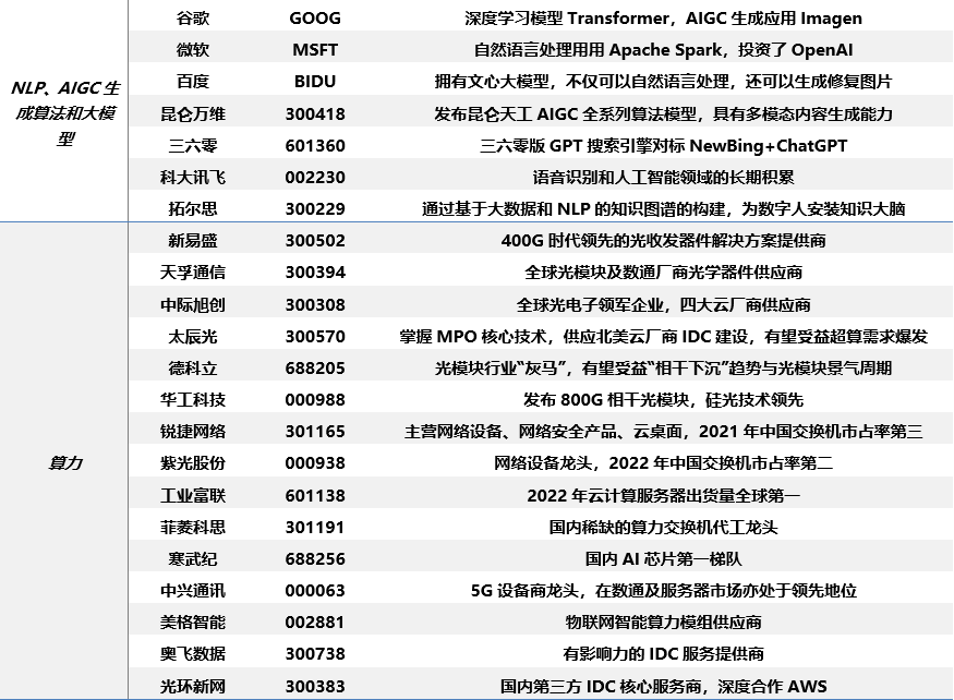 2) 算力:新易盛、天孚、中际旭创、德科立、太辰光、联特科技、锐捷网络、中兴通讯、紫光股份、寒武纪、工业富联、美格智能、移远通信、广和通、光环新网、中国电信、中国移动、中国联通;