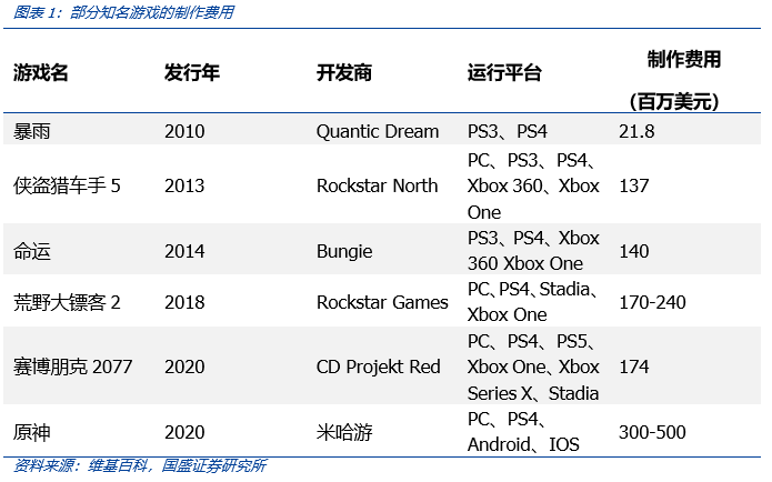 其次,一个典型的游戏开发团队主要有三种职位:策划、美工和程序,这三大工种之下可以分为文案、数值、关卡、2D、3D、角色、场景、音频、测试等 20 个职能。游戏作为一个注重用户体验的产品,需要将目光聚焦在产品、内容的丰富程度,而在完善内容的丰富度、拓展游戏的开放性的过程中,需要策划、美工等职位的相互协调和在游戏质量上的大量投入。所以,对于传统游戏行业,在必须兼顾高效率与高质量的条件下,高成本也不可避免。