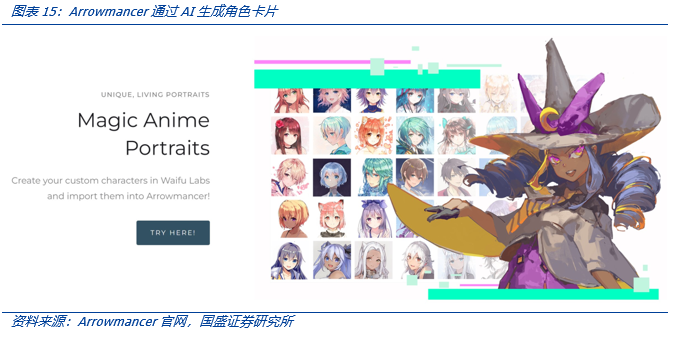 此外,还有一款名为《Arrowmancer》,运用了 AI 带来了全新的玩法。Arrowmancer 是一款由 WaifuLabs 团队制作的全 AI 绘图游戏,主要运用了 AI 技术生成和融合独特的二次元角色。在这款游戏中,AI 技术的应用主要表现在以下几个方面: