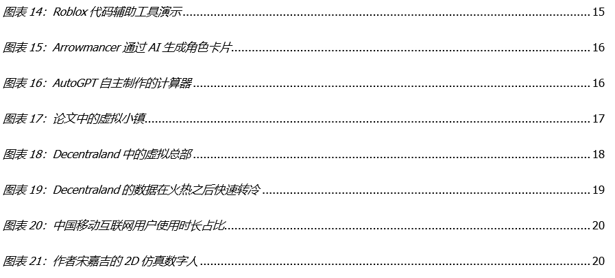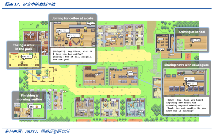(2)市场认可 AIGC+游戏逻辑,却低估了元宇宙的愿景。路演中大家认可 AIGC 对游戏行业的降本,但忽略了玩法创新。AIGC 因为有产品、有用户,市场都认为它比元宇宙靠谱,但我们认为,元宇宙本身就是长期愿景,这一愿景如今依然存在,而 AIGC 是连接这一数字愿景的良机。在 AIGC 的助力下,用户可以以“上帝视角”扮演不同角色穿越于各个场景中,而 AIGC 将是重要工具,这一理念已经在斯坦福大学和谷歌联合发表的一篇名叫《GeneartiveAgents: Interative Simulacra of Human Behavior》论文中被阐述,或许这正是开启元宇宙的另一重序曲。