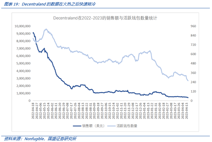 Decentraland 等元宇宙首批平台对终端配置要求过高,严重影响了用户体验,在经历了初期的火热之后变得门可罗雀。在 2022 年的一年时间里,Decentraland 不论是销售额还是活跃钱包数量都发生了断崖式的下跌。销售额从 2022 年最高的约 9 百万美元下跌到现在约 40 万美元,下降了约 95.7%,而活跃钱包数量从 2022 年最高的 900 多个下跌到目前的约 250 个,下降了约 72.2%。这固然有 NFT 市场趋冷的影响,但本身产品的不足亦不容忽视。相比于成熟的 Web2 应用,这类平台的用户非常小众化。