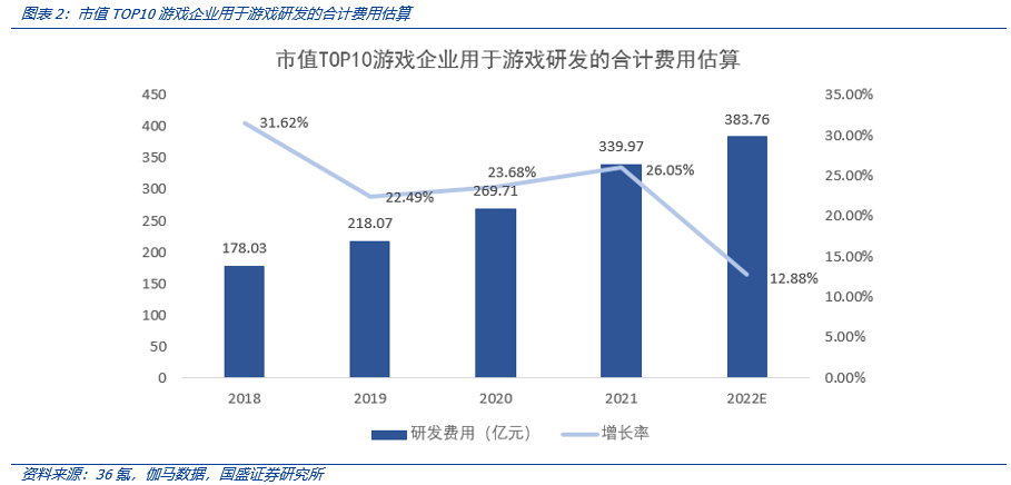 高成本只是其一,成本上涨速度快才是关键。2010 年发布的互动类电影游戏《暴雨(Heavy Rain)》引起了极大轰动,其制作成本约为 2100 万美元;而 2020 年发布的开放世界角色扮演游戏《原神》制作成本约为 3-5 亿美元。2018 年,中国市值 Top10 游戏企业用于游戏研发的合计费用约为 178.03 亿元;2022 年,这个数字预计将上涨至 383.76 亿元。在短短 5 年的时间里,Top10 游戏企业用于游戏研发的费用提升了一倍有余,除了 2022 年,每年的费用增长率都在 20% 以上。