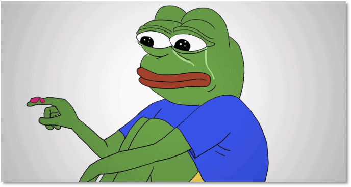 提起数字货币市场,比特币和以太坊最为人所熟知,前者是资产属性更强的“数字黄金”,后者作为底层网络资源,孕育出大量的区块链应用程序。许多人不知道的是,在种数以万计的数字加密货币中,还有一种特殊的项目类型,圈内人形象地将称之为“土狗”。顾名思义,这类项目既没有大牛技术团队加持,也没有投资机构青睐,贴在它们身上的标签往往是“草根”、“山寨”以及“骗局”。这类项目近期在币圈又掀起了一波投机狂潮,其中的典型代表是 PEPE 币,半个月里翻了 27 万倍。我没写错,你也没看错,不是“倍”,是“万倍”,而且一小撮人因为押中了这只“土狗”赚了个盆满钵满。严格来说,PEPE 是一种 meme 币,“meme”是同一个文化氛围中流行的或以衍生方式复制传播的互联网文化。它可以是一句流行语,比如“你大爷永远是你大爷”、“奥力给”,也可以是一个流行的表情包,比如下图这只名叫“pepe”的悲伤蛙,相信你在互联网冲浪时已经见过它无数次了。PEPE 币正是抓住了悲伤蛙这个全球流行的 meme 元素诞生的。