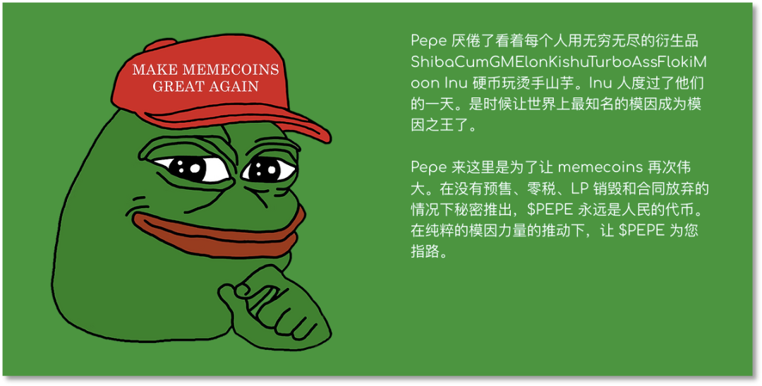 火遍全网的悲伤蛙 pepe至于 PEPE 为什么在币圈火了,谁也说不清楚,只是这个项目出现了,一些币圈大 V 开始谈论它,有人去购买它,热度越来越高,买的人也越来越多。至于价值,官网说了,PEPE 完全没用,仅供娱乐,没有正式的团队或项目发展路线图,也与悲伤蛙的创作者没有任何关联,只是向大家喜欢和认可的 meme 致敬。这就是“土狗”的典型特征,发起人是谁都无所谓,没有路线图,明目张胆地强调“价值为 0”,就像一场玩笑。公链代币可以当网络资源使用,去中心化应用代币尚且具有用户投票功能,但“土狗币”项目啥用没有,仅凭热度和娱乐性支撑。正如一名大 V 所说,PEPE 暴涨的原因很简单,就是热度到位,情绪到位。PEPE 的官方宣言,很有娱乐色彩和煽动性,它说它的出现就是为了让 meme 币再次伟大,是时候让世界上最知名的表情包成为 meme 币之王了。于是,根据加密货币数据统计平台非小号的数据,自 4 月 15 日上线以来,PEPE 上涨了 27.4 万倍,流通市值从 0 上蹿到超过 10 亿美元。