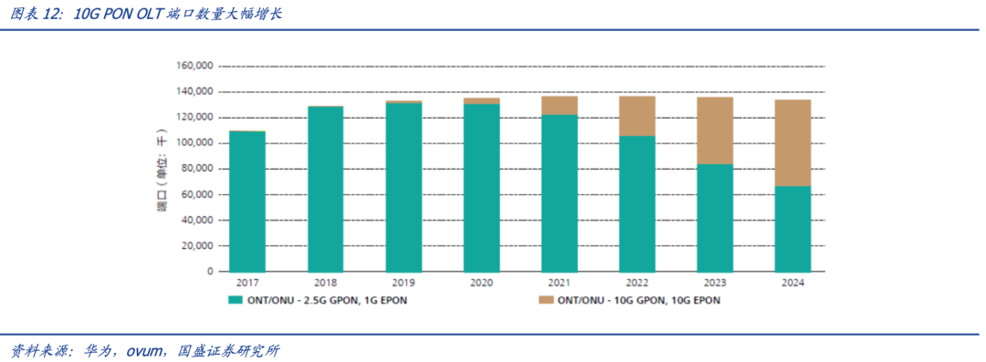 接入网行业具备高技术壁垒。当前主流的 EPON/GPON 技术采用 1.25G/2.5G 光芯片,并向 10G 光芯片过渡。10G-PON 技术支持数据上下传速率对称 10Gbps,能够更好地满足各类高速宽带业务应用的接入网络需求。随着双千兆的持续推进,以及国内宽带网络不断升级,当前 10G PON 的需求已经开始逐步超过 GPON 成为市场主流,同时未来有望进一步升级到 25G/50G PON 等。