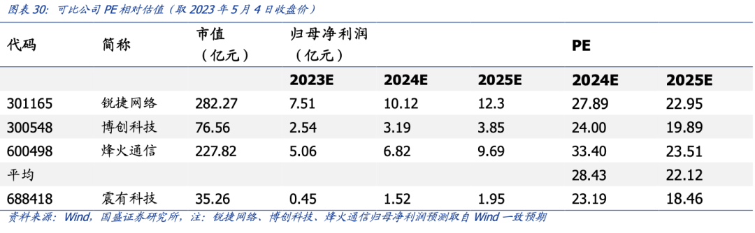 投资建议:公司作为掌握核心网技术的优质通信公司,随着新业务放量,宏观环境回暖,有望实现基本面持续向好。我们预计公司 2023-2025 年收入为 11.52/18.96/25.73 亿元,归母净利润为 0.45/1.52/1.95 亿元,对应当前股价 PE 分别为 78/23/18 倍。我们选取锐捷网络、博创科技、烽火通信等国内外专网设备供应商作为可比公司,2023 年公司处于盈利修复进程,2024 年公司业绩放量后,估值相较行业可比公司仍有上行空间。公司作为卫星网核心标的,具有稀缺性,首次覆盖,给予“增持”评级。