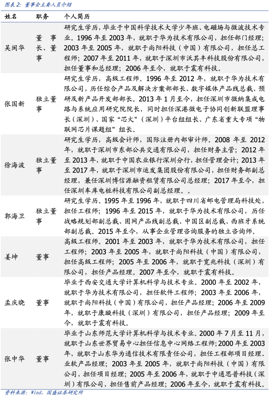 公司股权结构较集中,高管团队拥有丰富业内经验。董事长吴闽华是公司控股股东及实际控制人。吴闵华直接持股比例高达 16.6%,且通过震有成长间接持股 14.9%,合计控制 31.5% 公司股份。此外,华胜鼎成、新疆东凡分别持有公司 6.35% 和 3.73% 的股份。公司董事长吴闽华曾在华为担任部门经理,与此同时,震有科技另外几位董事会成员中也大多师出华为。由此可见,高管团队丰富且专业的业内经验为公司的技术水平打下了基础。