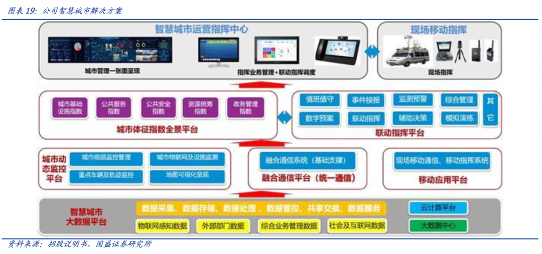 同时,公司积极顺应智慧城市发展潮流,在成熟的专网技术之上推出了智慧城市运行智慧中心解决方案,公司的智慧城市运行指挥中心解决方案集城市运行管理、运营监控、指挥调度、协同办公、辅助决策、民生服务于一体,实现城市信息共享融合、互联互通和业务协调。公司于 2019 年成功中标吐鲁番智慧城市项目,项目金额高达 6273 万元。