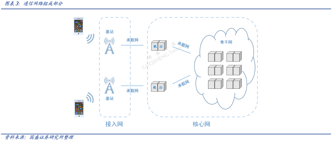 核心网是通信网络的“管理中枢”,所蕴涵的技术最多,开发难度也最大,具有高技术壁垒,软硬件一体的特征。在公网领域,网络架构共分为三层,核心网作为整个通信网络系统的控制部分,相当于人体的大脑和神经,负责用户认证、呼叫、路由、计费等所有控制功能。汇聚层是网络接入层和核心层的“中介”,就是在工作站接入核心层前先做汇聚,以减轻核心层设备的负荷。汇聚层具有实施策略、安全、工作组接入、虚拟局域网(VLAN)之间的路由、源地址或目的地址过滤等多种功能。接入层是指骨干网络到用户终端之间的所有设备,宽带接入网已成为当前主流的网络接入技术,其接入方式主要可以分为有线宽带接入与无线宽带接入。