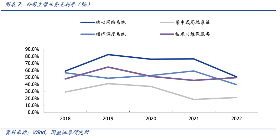 从各业务的毛利率来看,核心网络系统毛利率较高,2018-2022 年毛利率分别为 58.6%/82.1%/75.6%/76.0%/50.46%。从趋势上看,核心网络系统和集中式局端系统在 2018 年均处于低位,主要原因是公司承接了 UTStarcom 的 BSNL 三期网络建设项目,项目成熟,毛利率低。2019 年公司新业务产品结构原因,毛利率提升。指挥调度系统产品定制化程度较高,公司议价能力较强,2018-2022 年毛利率分别为 56.2%/48.4%/52.4%/58.8%/39.3%。