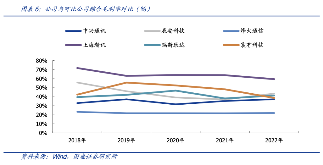 公司 2018-2022 年综合毛利率分别为 42.26%/55.58%/52.43%/48.14%/38.64%,高于可比公司均值,该差异主要由业务属性和产品类型差异所致。除了集中式局端接入产品和传输产品外,公司还为客户提供毛利率较高的核心网络系统和指挥调度系统。2019-2021 年公司毛利率总体略低于上海瀚讯,2018 年和 2022 年公司毛利率总体略低于上海瀚讯和辰安科技,主要系上海瀚讯和辰安科技是单一领域专网龙头,辰安科技专注应急安全业务,上海瀚讯主营业务为向军方和铁路等行业提供专网通讯的整体解决方案,该类产品的毛利率较高。相比之下震有业务面覆盖广得多,针对各个细分行业的定制化能力强大。