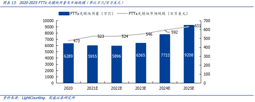 根据 LightCounting 的数据,2020 年 FTTx 全球光模块市场出货量约 6289 万只,市场规模为 4.73 亿美元,随着新代际 PON 的应用逐渐推广,预计至 2025 年全球 FTTx 光模块市场出货量将达到 9208 万只,年均复合增长率为 7.92%,市场规模达到 6.31 亿美元,年均复合增长率为 5.93%。