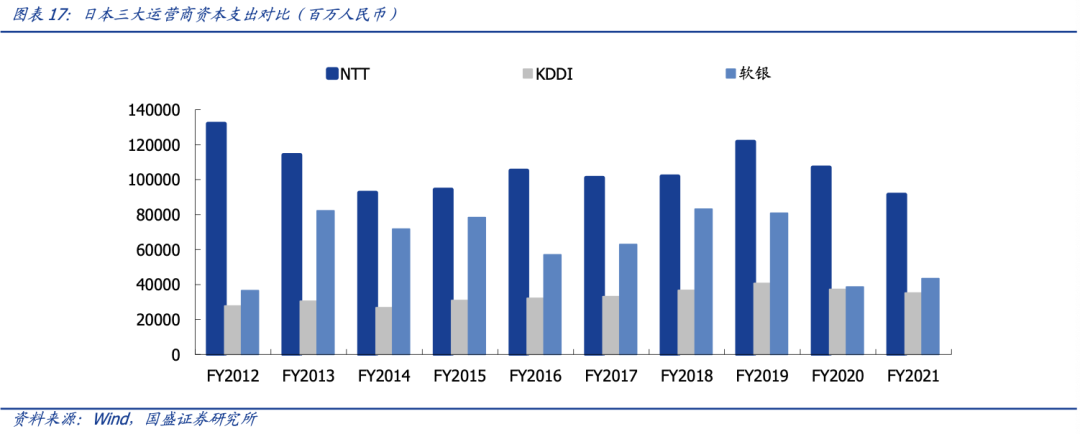 其中,日本电信市场是发达国家电信市场的一个缩影。日本电信市场起步较早,经过二战后几十年的发展,已经形成了充分竞争的市场格局。在 2009 年,日本的家庭快带覆盖率已经达到了 98.6%。日本目前的电信运营商呈现出三足鼎立格局,三家分别为 NTT 集团(包括 NTT Docomo),KDDI 和 Softbank。NTT 和 KDDI 是技术驱动型,而 Softbank 是业务驱动型,Softbank 在资本开支、净利润等经营指标方面比例持续提高。