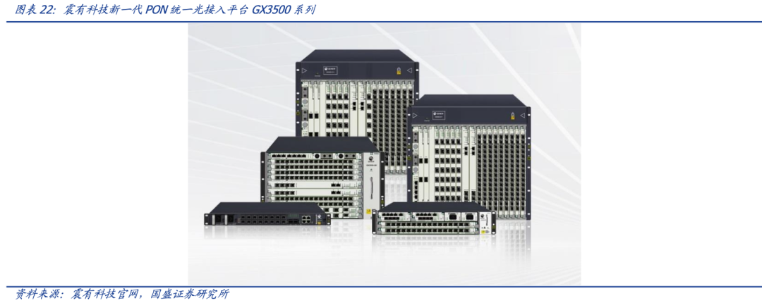 作为通信领域专业的解决方案供应商,“技术创新和坚持国产化”是震有科技一直秉持的发展理念。经过多年对 PON 技术领域前沿研究与深耕细作,已拥有 1U/2U/5U/7U/11U 的 GX3500 全系列 OLT 局端设备及多种业务形态的 ONU 终端产品形成的 F5G 综合应用解决方案。GX3500 系列是震有科技推出的新一代 PON 统一光接入平台,采用业界领先的芯片级解决方案,提供丰富的软硬件特性,能够提供 GPON,XG(S)PON,XG(S)PON Combo 等混合模式的光接入方式,满足 F5G 的各种应用场景,适应运营商网络的低时延、高带宽、高可靠性、长期平滑演进需求。2022 年,公司推出的 10GPON 产品受到市场欢迎,目前已进入量产阶段并中标国内部分电信运营商的集采。