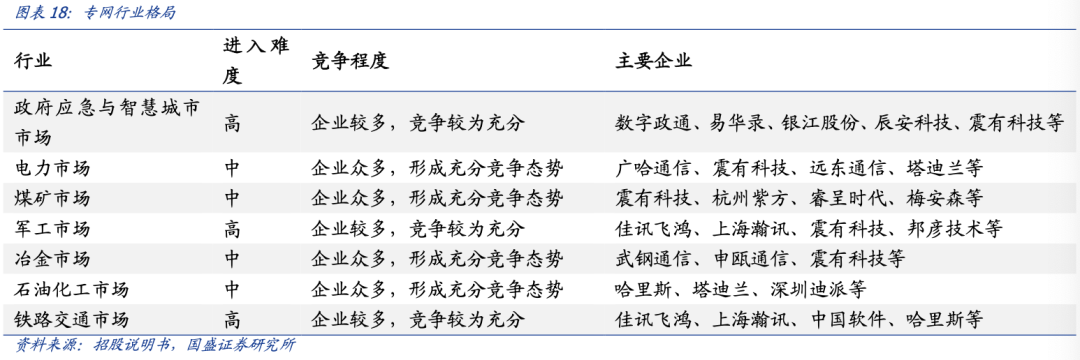 从总体市占率上来看,我国专网通信市场较为分散,不存在一家独大的现象。具体的竞争格局方面,在电力、煤矿、冶金、石油化工等行业指挥调度系统竞争厂商较多,属于完全竞争市场;军工、铁路交通、政府应急与智慧城市受相应准入机制或竞标资格的影响,具有一定的行业进入壁垒,市场化程度相对较低,已进入企业较多,竞争较为充分。