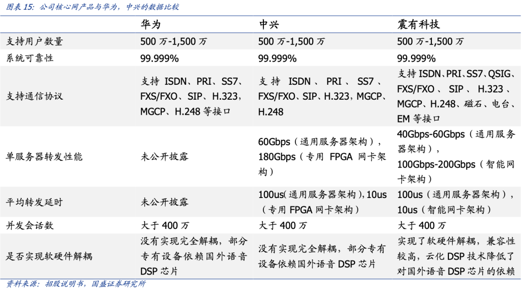从产品方案的完整性角度看,在国内只有华为、中兴、诺基亚贝尔以及公司能够提供全系列核心网产品。公司核心网端到端解决方案可提供 UTEx CSCF、IMS 信令网关、IM-MGW、MRFP、IM-HSS/HLR/SLF/AAA、AS 服务器、SBC 和 CCF 等网元,在 IMS、NGN 和软交换应用方面已经非常成熟,在全球已部署超过数千万级用户。公司是国内除了华为,中兴,诺基亚贝尔之外唯一能够提供包括 4G/5G 数据核心网、4G VoLTE/5G IMS 话音核心网、融合信令网 STP 等在内的全系列电信级、大容量的核心网系统方案的厂商。其他国内厂商一般只提供部分电信级产品或者小容量、用于企业专网市场的产品。同时,与华为与中兴相比,公司的核心网产品现有技术水平,均处于同一水平。