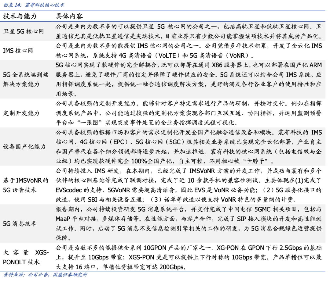 公司于 2009 年陆续推出 WCDMA/TD-SCDMA 无线 3G 全系列的语音和数据核心网,并后续推出 4G 核心网 EPC 产品和行业基站产品。产品采用电信级设计,所有的关键部件全部支持热插拔、单机系统热备和地理冗灾备份设计,提供高性能高可靠的解决方案系统。2013 年起,公司陆续推出了全系列的 3G 和 4G 运营商级大容量核心网,支持单系统 500 万线以上容量,多系统千万级容量,是行业内少数能够提供大容量核心网解决方案的公司之一。信令网支持号码携带业务超过 3 亿用户,成为全球为数不多能够提供该能力的厂商之一。基于 3G/4G/IMS 核心网技术积累,公司积极研发了 5G 核心网。在已有的移动管理、接入管理、信令处理技术、VoIP 媒体网关技术、虚拟化管理、网管系统、运营支撑系统的基础之上,公司投入大量研发费用攻关并解决 5G 核心网的关键新技术:NFV 虚拟化技术、VM 虚拟机技术、Docker 容器技术、用户面转发 SDN 技术、5G 服务化网络技术、5G 网络切片技术、5G 边缘计算 MEC、5G 语音视频通话 VoNR 等。