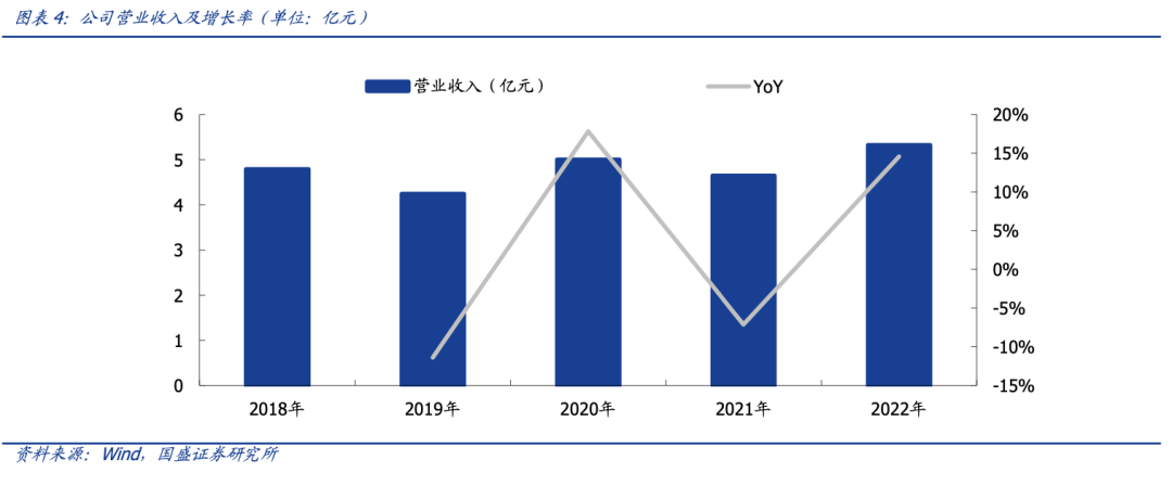 从总营业收入的角度,公司 2018 年营业收入 4.8 亿元,2019 年营业收入 4.2 亿元,同比减少 11%。2020 年 5.0 亿元,同比增长 18%;2021 年 4.6 亿元,同比减少 7%。2022 年,公司营业收入为 5.32 亿元。可以看到,公司营业收入近几年存在不稳定的特征,海外部分业务会受到政治因素的影响。