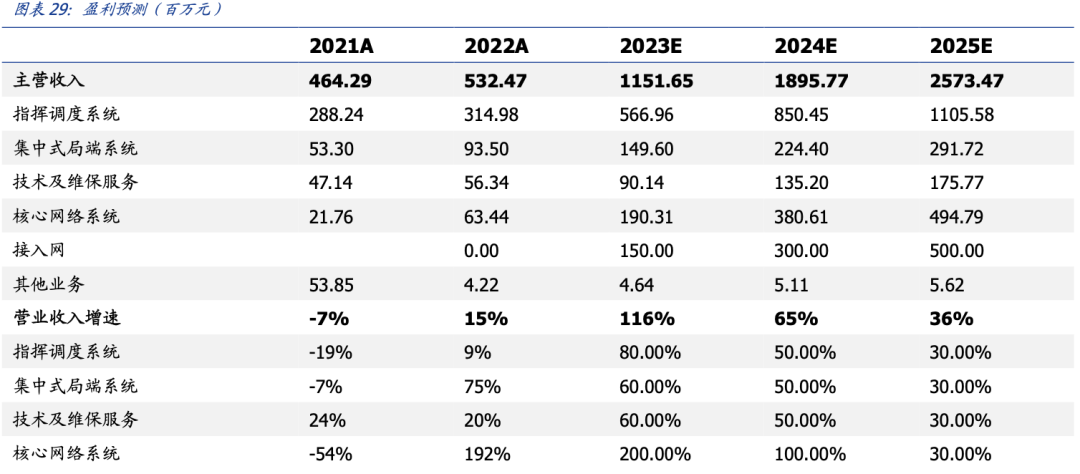 我们预计随着行业数字化加速与宏观经济复苏,公司专网业务将加速增长,对应公司 2023-2025 年指挥调度系统将同比增长 60%/50%/30%。