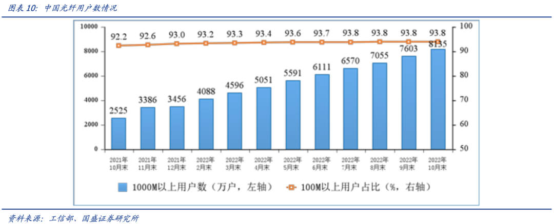 接入网设备包括铜缆、光纤两种方式,光纤是未来的发展趋势。从国内来看,加速建设千兆网络,推动千兆宽带渗透率,是运营商家庭业务走向未来,赢得竞争的最好战略选择,因此对于光接入行业来说,国内的升级浪潮是运营商盈利驱动下的长期逻辑,产业链发展空间将被进一步打开。2021 年,工信部印发了《“双千兆”网络协同发展行动计划(2021-2023 年)》,为我国千兆宽带加速完成从 0-1 阶段的渗透率打下了坚实的基础,从数据可以看出,从工信部数据可以看出,截至 10 月底,千兆及以上宽带用户 8135 万户,比上年末净增 4676 万户,占比达 13.9%,较前三季度提升 0.8 个百分点。在短短的一年时间内,千兆宽带用户数增加从 2525 万户高速增长至 8135 万户,完成了新技术的第一步渗透。