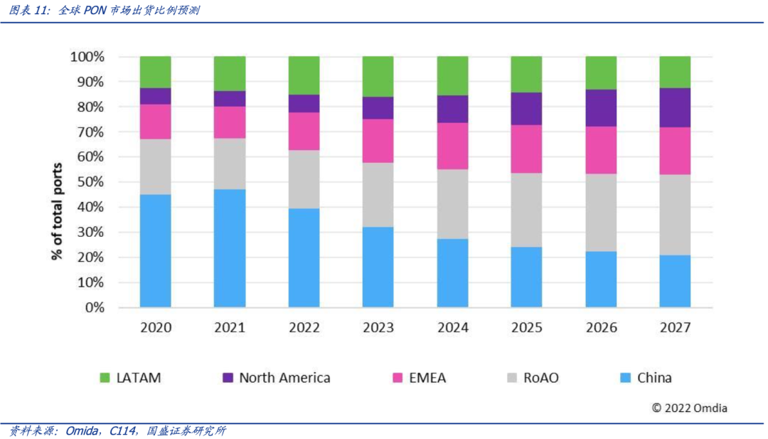 从海外来看,当前欧美国家政府纷纷出台支持运营商建设升级固网政策。根据光电通信数据,全球各地有多个国家已经发布了支持 FTTH 建设的明确政策和政府预算。随着海外政府侧对于光纤网络投入持续加大,海外有望成为全球 PON 设备增量额的又一大来源。根据 Omdia 数据,2020 年,中国占所有 PON 设备端口消耗量的 45%。预计未来到 2027 年,欧洲、中东和非洲(EMEA)以及亚洲和大洋洲其他地区的运营商将消耗所有 PON 端口的 51%,大幅高于 2020 年的 36%。