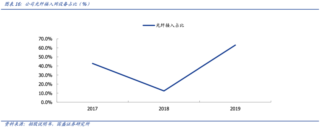 与核心网相比,不同国家在接入技术的发展程度不同,其主流接入方式存在差异。欧洲、印度、日本等国家因为发展较早或者发展水平较低等原因,仍然有较大规模的铜缆接入市场。公司精准切入这一市场,为客户针对性的提供铜缆接入网设备,覆盖了从大规模接入容量到中小规模接入容量的多种形态产品。凭借铜缆接入网设备,公司成功切入了日本软银,意大利 Tiscali、英国泽西岛电信(JT)的供应商体系,以较小的规模和知名度,实现了对于发达国家运营商的市场突破。与此同时,公司在凭借铜缆设备打入接入网市场后,积极开发适用于光纤的接入网设备,适应运营商的不同种类需求。2019 年,公司在光纤接入网设备占比达到 63.01% 的新高。