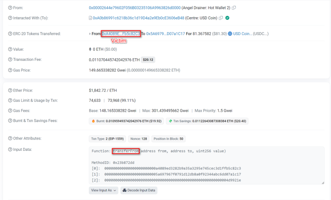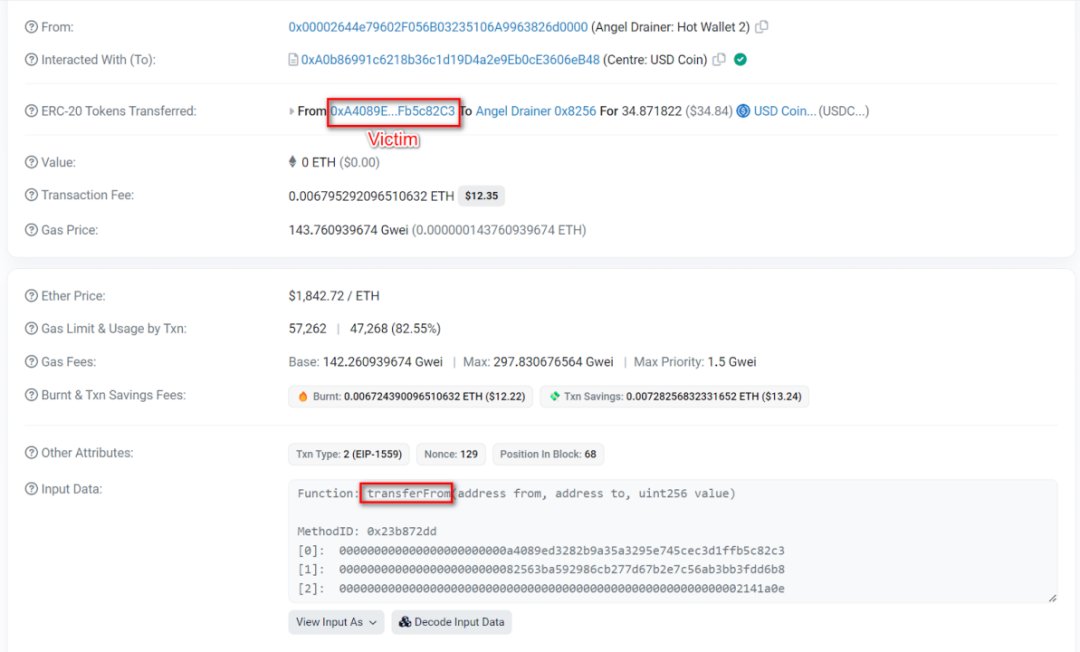 从这两笔交易来看,合约调用者(0x00002…d0000)通过调用 TransferFrom 函数,将受害者地址(0xA4089…82C3)上的 34.87 USDC 转移到(0x8256…D6B8),将 81.36 USDC 转移到(0x5A69…1C17)。如果光看 transferFrom 函数,不难发现这个函数的作用是:允许第三方发起一笔交易,将相关数字资产从所有者账户转移到接收者账户。