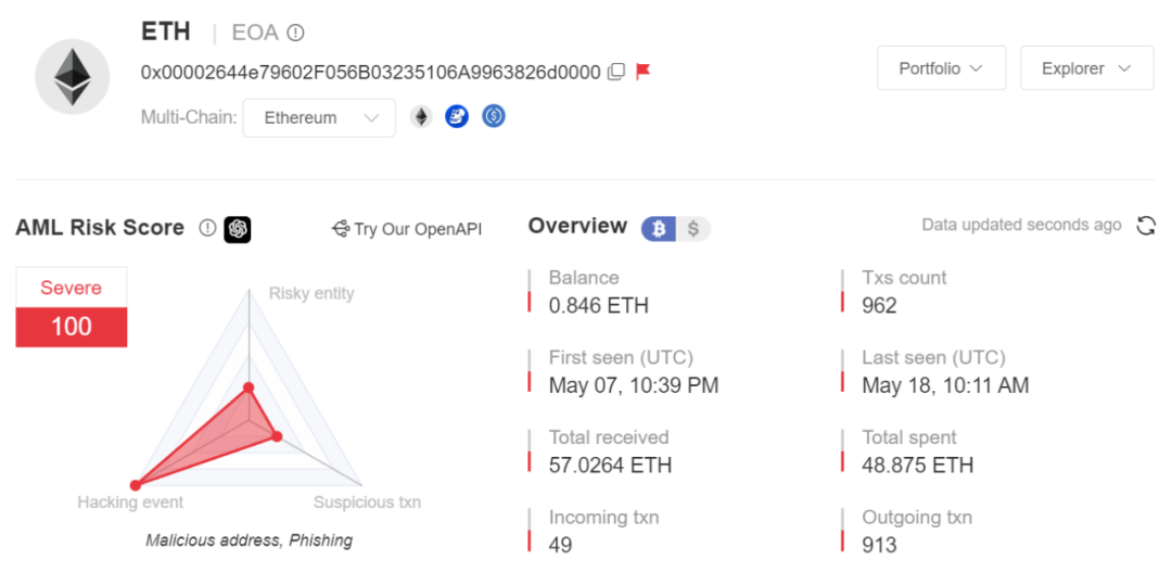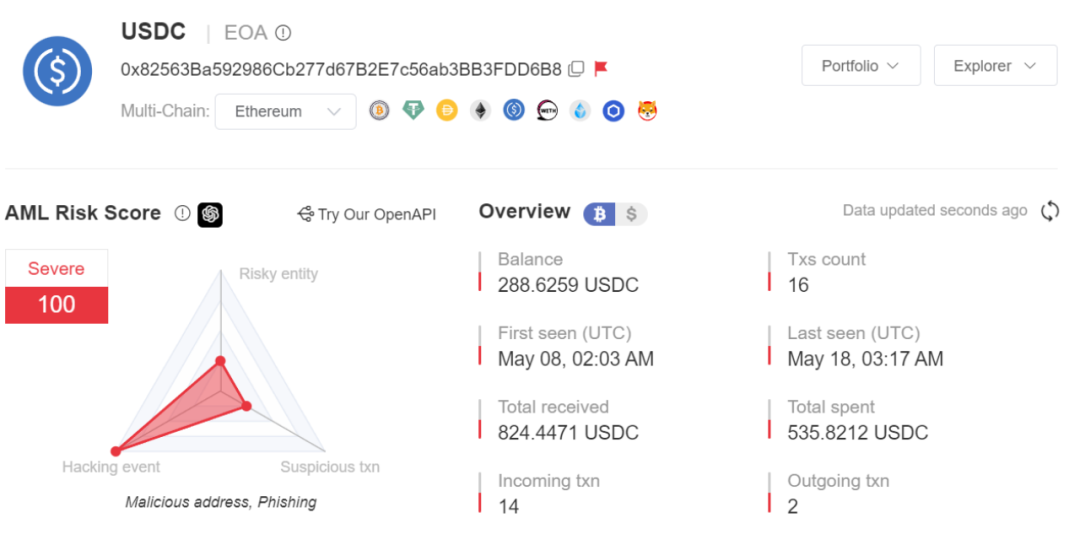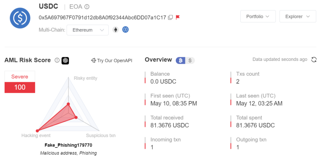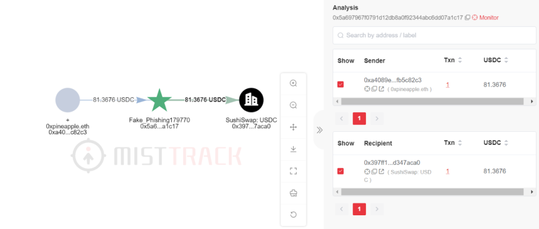 目前黑客地址已经被 MistTrack 标记为恶意钓鱼地址。