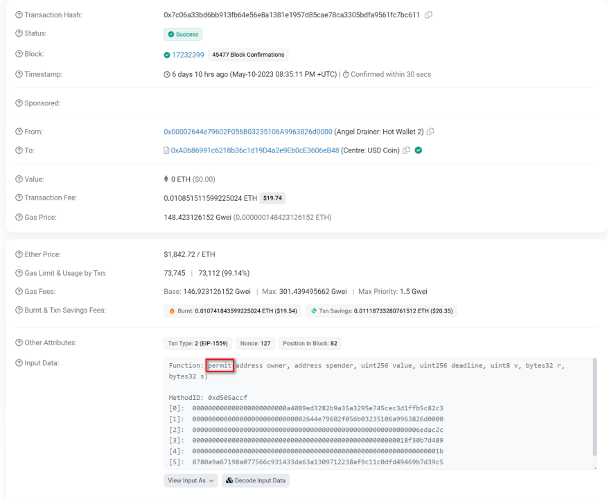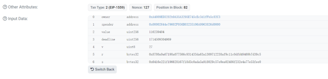 其中 deadline 为 1714509304969,value 为 116239404,也就是说授权在 56300 年 8 月 22 日 0 点 42 分(GMT)前都有效,几乎是无限期了。且这笔授权的代币数量为 116.239404 USDC,与受害者被盗的数额相同。v, r, s 值即为用户(owner)在钓鱼网站进行签名后的签名数据,permit 函数会验证签名数据的有效性。签名验证通过后就会将用户的代币授权给黑客(spender)。