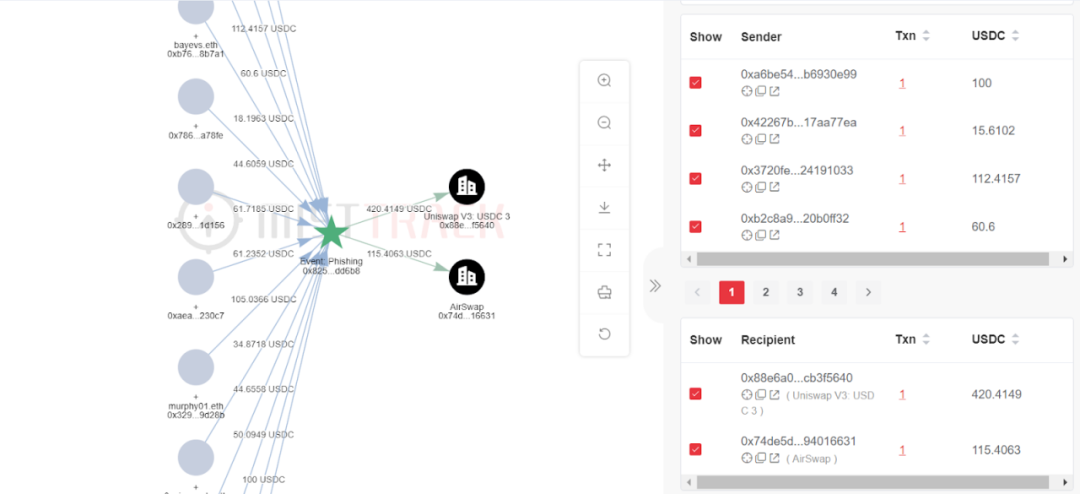 使用 MistTrack 对 ETH, WBTC, USDT, USDC, SHIB, DAI, WETH, DAI, stETH, APE 币种进行分析,目前地址 1 获利约 12 万美元,地址 2 获利约 20 万美元,地址 3 获利约 2,000 美元。此外,据 Web3 反诈骗平台 Scam Sniffer 的分析,截止 5 月 9 日,一共有 300 多名受害者被基于 Permit2 的恶意签名盗取了约 69 万美金的资产,从 Uniswap 推出 Permit2 到 5 月 9 日 为止,以太坊主网上已经有近 67 万个地址授权过 Permit2 了。当然,这个数据针对这个团伙的全貌来说只是冰山一角,本文重点不在此,故不再深究。