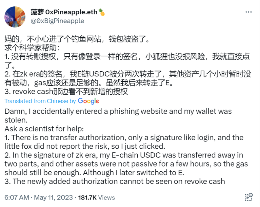 5 月 11 日,推特用户「pineapple.eth」发推表示自己因误点钓鱼网站(syncswap[.]network)致钱包被盗,损失超 100 美元。