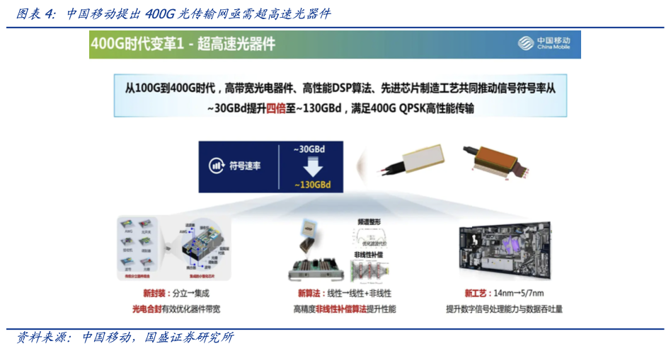而在电信侧,根据中国移动近期发布的《400G 全光网技术演进及应用展望》指出:“超大带宽和超低时延时东数西算等业务的核心需求”,提出骨干网亟需加速向 400G 演进。速率演进带来新技术的上马:CPO 光电共封装、5/7nmDSP 单元等,进一步印证了行业上行周期来临的逻辑。
