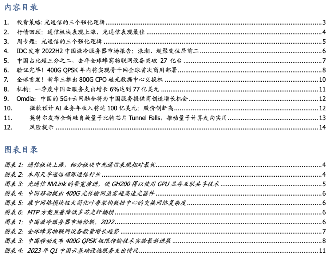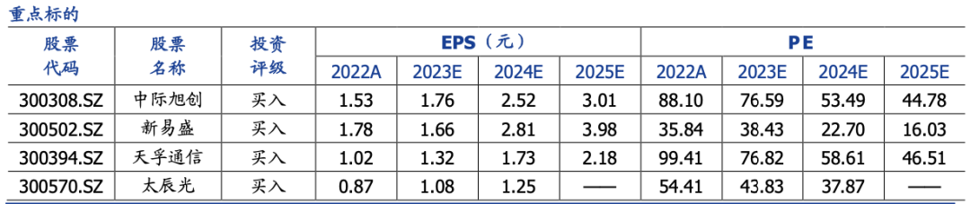 我们认为,随着 AIGC 应用的普及和超大规模数据中心的算力需求,800G 交换机和 800G 光模块出货量有望从 2023 年起迎来爆发式增长,利好相关产业链厂商。同时建议关注 CPO、硅光等前沿技术应用进展。