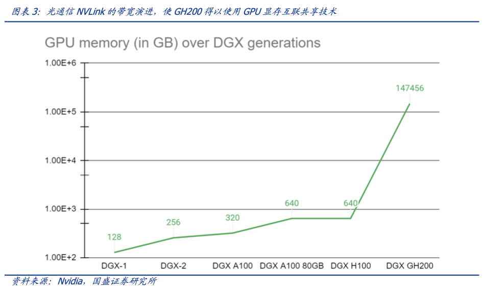一、光模块需求的确定性加强。市场此前担忧供给侧,高端光模块 100G EML 和 DSP 芯片产能无法满足 800G 光模块的需求量。我们认为,“风浪越大,鱼越贵”,越是遇到技术难关、产能吃紧,光模块产业链的价值与壁垒才越能得以体现;同时,相比起订单量预期的博弈,产业趋势才是关键,市场不断刷新头部光模块厂商历史新高的估值,更多是看好 AIGC 催化下,光通信产业的景气度上行——AI 算力资源相继告急,而在 AI 超算中通信能力成为“木桶”中重要的一块“木板”,光通信能力直接影响到超算性能的上限。英伟达的技术文档指出,光通信 NVLink 的带宽演进,使 GH200 得以使用 GPU 显存互联共享技术。