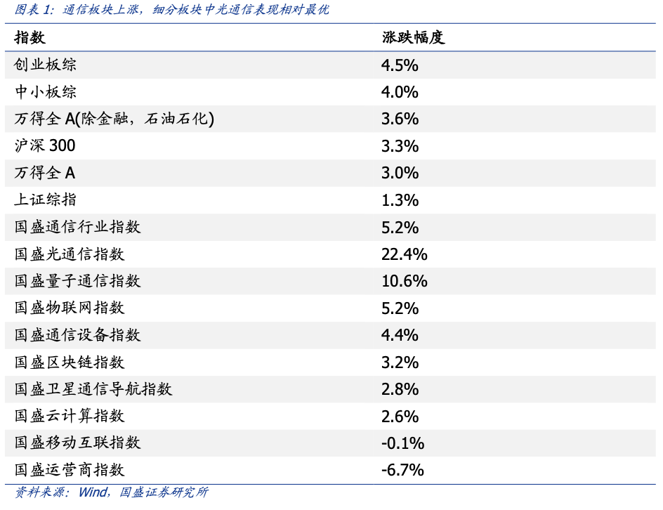 二、行情回顾:通信板块表现上涨,光通信表现最佳