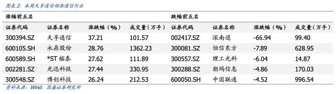 本周受益光通信概念,天孚通信上涨 37.21%,领涨板块。受益光通信概念,永鼎股份上涨 28.76%,受益公司重整,*ST 榕泰上涨 27.62%,受益光通信概念,光迅科技上涨 27.44%、博创科技上涨 26.24%。
