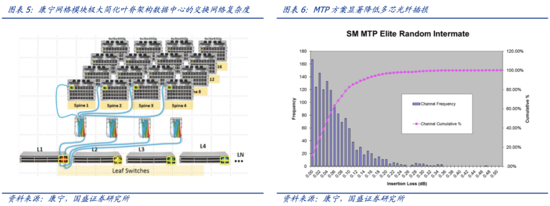 三、AI 超算场景下,高速率、大密度光连接的确定性加强。随着 800G 光模块周期启动,对应光模块之间光纤互联需求也将确定性升级、放量。同时,在超算这一场景下,光连接的空间利用效率是工程上需要重点关注的难点之一,提升光器件的结构密度,有望提升数据中心的维护效率、提升散热效率、降低插损、降低维护成本。根据光纤光缆龙头康宁的最新方案,我们注意到其数据中心的相关产品剑指高密度连接,以匹配快速上升的 AI 超算内部数据交换流量。