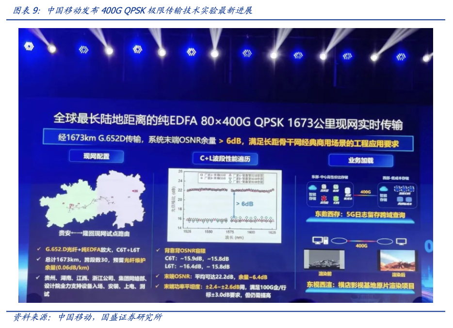 在贵安-隆回现网试点,中国移动联合设备厂商基于 G.652.D 光纤 + 纯 EDFA 放大,预留光纤维护余量(0.06dB/km),系统末端 OSNR 余量>6dB,验证了 400G QPSK 满足长距骨干网经典商用场景的工程应用要求,打赢其商用部署前的“收官之战”。