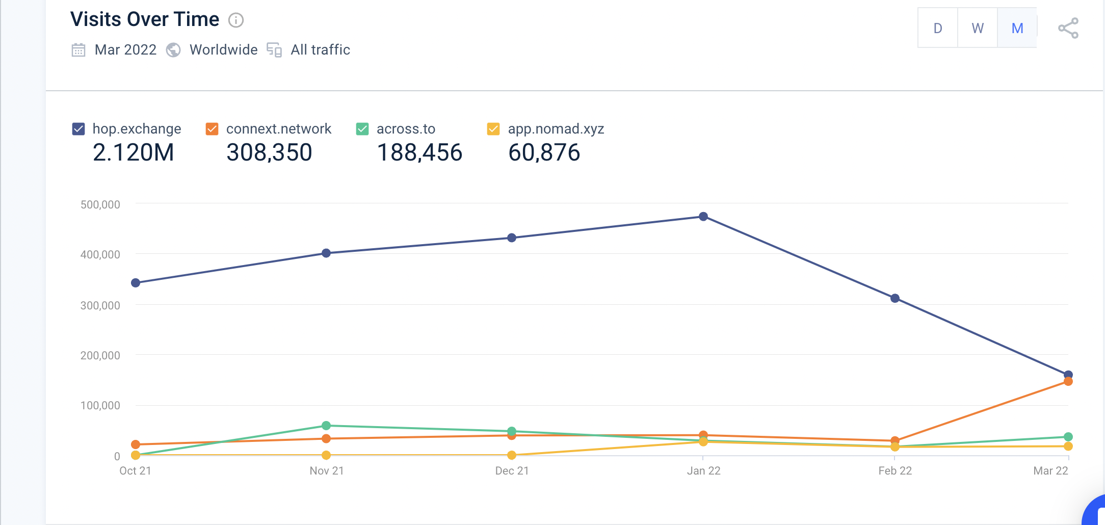 从场外热度看,Hop bridge 目前仍然一骑绝尘,Connext 与 Nomad 的集成造成的热度导致大众对其关注也逐渐增加。