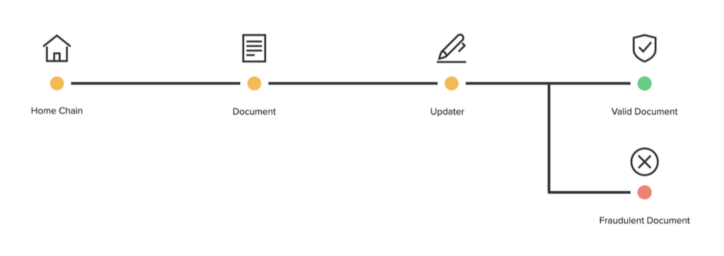 发送链(home chain)产生一系列消息(document),签约公证人(updater)签署。如果公证人出示伪造的副本,会收到惩罚且广播,所有客户都知道其是恶意的,便可阻止访问其账户。