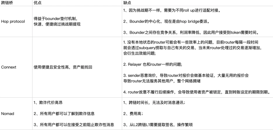 Connext 的优势在于实现了跨链和和 L2 Trustless 发送价值和调用合约,但缺点是不允许完全通用的通信,但它的延迟确实要低很多。依赖于 Nomad 高安全性,吸收 Nomad 的信任/风险。