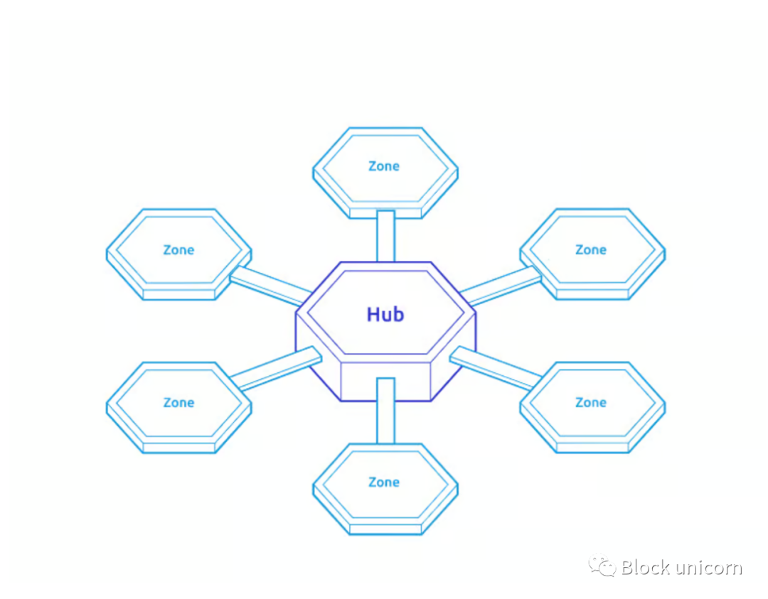 分区链(Zone)是在 Cosmos 区块链网络内创建的独立的区块链应用程序,而中心(Hub)是连接这些分区链的区块链,中心(Hub)区块链保持与分区链之间也能相互连接。