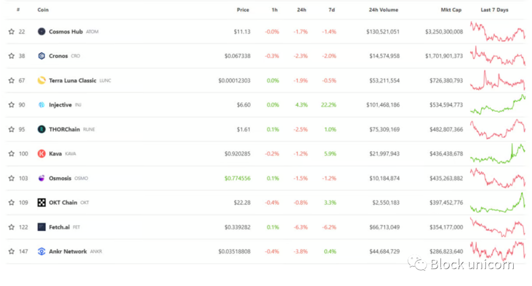Cronos Chain:由中心化加密交易所 Crypto.com 资助,Cronos Chain 是在 Cosmos 上构建的与以太坊兼容的区块链。Cronos 采用 PoS 算法运行,以 Crypto.com 的 CRO 代币作为主要加密货币。