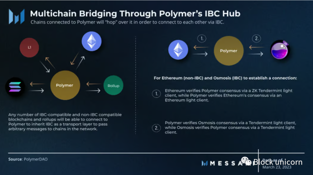Polymer 是一个 Cosmos 应用链,充当 IBC 中心,允许链之间进行通信。Polymer 使连接的链可以选择自己的验证方法,同时通过将 IBC 标准化为传输组件(类似于 Electron Labs 和 zkBridge 的实现)提供默认的 ZK 轻客户端验证,与 Polymer 相连的链还将可以访问 Cosmos SDK 和 Interchain 账户(Interchain 账户是指在 Cosmos 生态系统中的一种账户类型,用于在不同的区块链之间进行跨链资产转移和交互)。