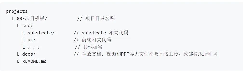 2. 先在 projects 里生成一个目录,以你们项目名称命名,里面先放个空档案,或 readme 简单介绍项目。提交一个 PR 进来。目的是预留一个目录作为你们项目空间。注意我们会把目录改名,在项目名称前加个编号。请 pull 下来。