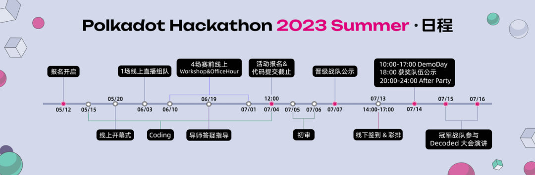 7 月 15 日 -7 月 16 日,2023 夏季波卡黑客松大赛将在线下举办 Demoday 和 Decoded 大会演讲,届时更有行业领军人、技术大咖、投资人等一众大咖莅临现场,给你全新的技术视野和开发灵感。如果你也想成为站上终极赛场的幸运儿,只要你也想和我们一同见证波卡生态的高光未来,那就赶快加入我们吧!最后 5 天时间,给自己一个成为 Web3 明星开发者的机会!