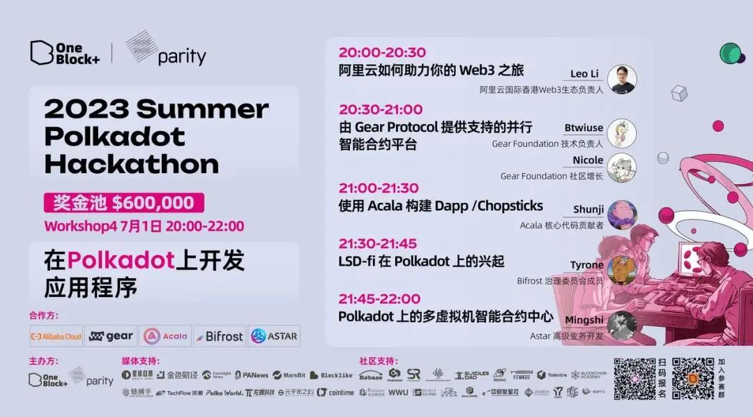 作为本届黑客松之旅的“护航者”,赛前指导 Workshop 即将迎来收官活动。在前 3 场活动中,相信你已经追随技术大咖们的步伐,掌握区块链技术工具的使用方法,尝试构建个性化的智能合约,借鉴区块链基础设施上的创新设计,准备好在 Web3 世界一展身手。为了让更多参赛者能够在本届黑客松大赛中沉浸式体验 Polkadot 的技术魅力,顺利在波卡生态中孵化出下一代明星项目。赛前指导“压轴戏”Workshop 第 4 场将带你学会 「在 Polkadot 上开发应用程序」。阿里云、Gear、Acala、Bifrost、Astar 作为本届大赛的 Bounty 命题赞助商将亲临赛前指导直播间,和所有开发者一同探索在波卡生态中开发应用的路径与技巧。如果你也想在本届波卡黑客松大赛问鼎最高荣誉、全力冲刺奖金池叠加奖励,就请继续锁定本周六(7 月 1 日)晚 20:00 最后一场 Workshop!错过前三场赛前指导 Workshop 直播的小伙伴们可以观看 YouTube 回放:
