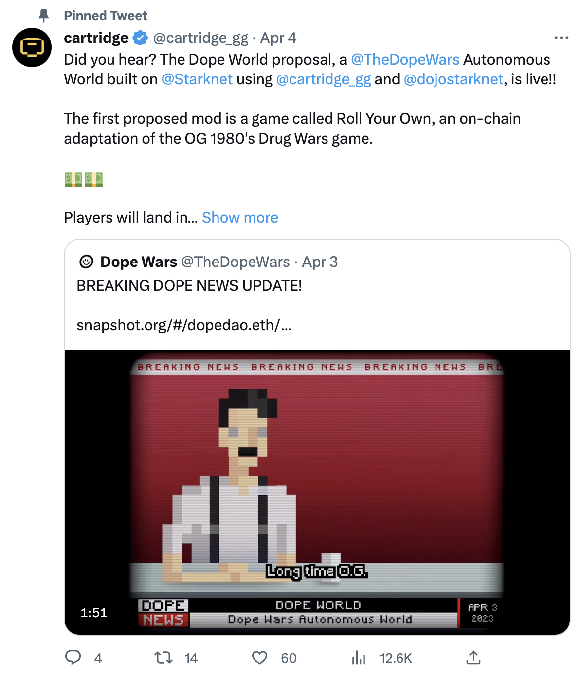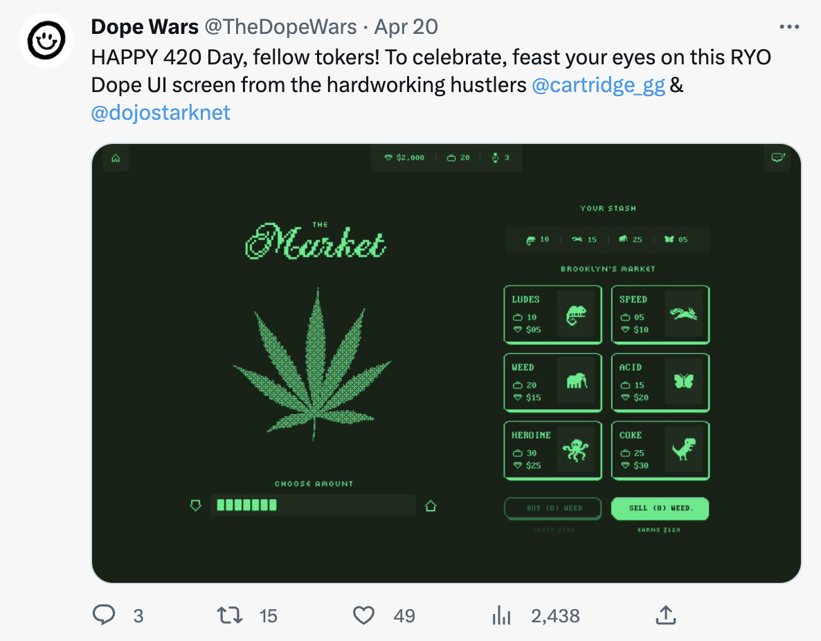 The Cartridge team proposes to seed Dope Wars on StarkNet with the Dope Wars Autonomous World and build “Roll Your Own” on top of it.