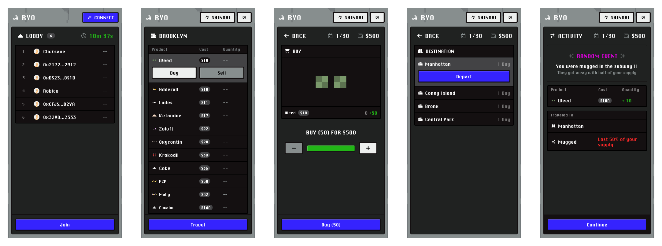 Roll Your Own (RYO) expands the core drug arbitrage mechanism into a multiplayer environment, creating a competitive and evolving gaming environment. In this environment, each player’s actions will influence the in-game economy.